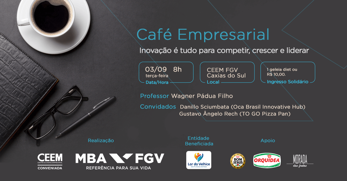 Quer saber mais? Então marque na sua agenda: dia 3 de setembro, terça-feira, às 8h, acontece o CAFÉ EMPRESARIAL: Inovação é Tudo para competir, crescer e liderar, no CEEM FGV Caxias do Sul. O evento será em formato de mesa redonda onde o professor do MBA FGV, Wagner Cardoso de Pádua Filho e os empresários convidados: Danillo Sciumbata e Gustavo Ângelo Rech falarão sobre a importância da inovação no mercado atual.